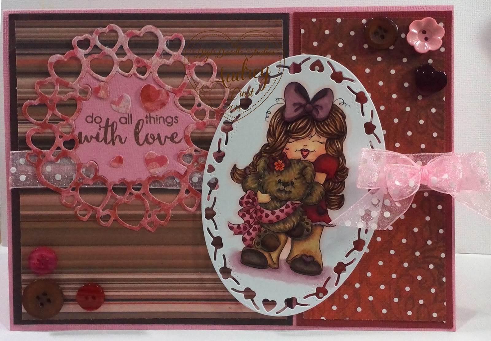 For my card this week, I chose Don't Pull So Hard digital image from The Paper Shelter Shop. I colored and highlighted this cutie with my Copics and Atyou Spicas, then cut out using die from Pink and Main. I chose Echo Park papers, added ribbon from Really Reasonable Ribbon, and sentiment is a clear stamp that I cut out with Nestie and embossed with Ranger distress ink on inside of die cut.