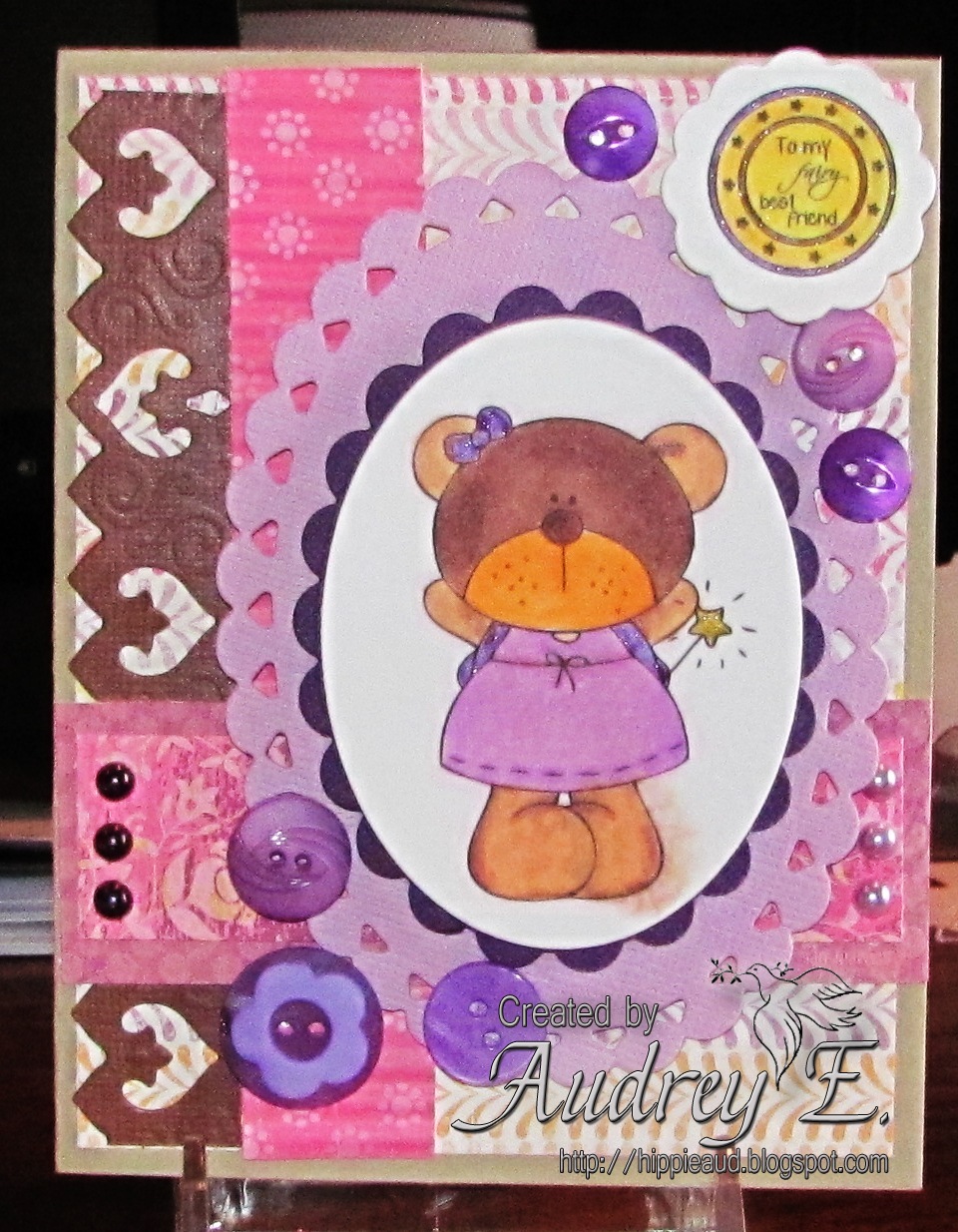 I used STAMPFAIRY's Linda Fairy as well as this week's FRIDAY FREEBIE, the sentiment, for my card. I followed the sketch from MIDNIGHT MADNESS for my creation. I colored Linda with Copics and Atyou Spicas, cut with Nesties. Scalloped oval also cut with Nesties and largest over cut with Nellie's die. Border done with Borderabilities die. Pearls from Prima. Used my crimper for pink flowered DP strip. Sentiment cut with Nesties, colored with Copics. Buttons from DeNami Designs. Base paper is SU kraft. I hope you like it!!
