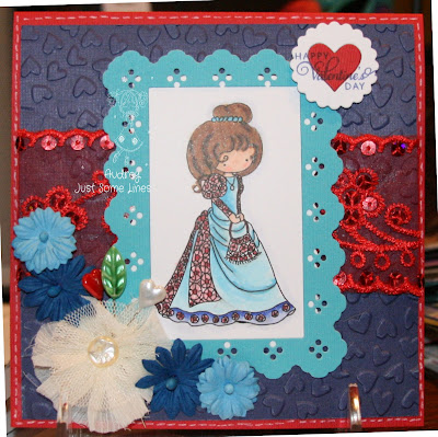 I chose EMO VICTORIAN 1 from JUST SOME LINES SHOP for my creation and I colored her with Copics and cut her with Nesties and then framed with Marianne Creatables die. I chose papers from Core-dinations and Taylored Expressions, I embossed the blue piece with Sizzix die and added some faux stitching around the base. Sentiment and dies are from Verve, flowers from Prima and Recollections and pins are from Taylored Expressions. Lace is from Hobby Lobby. I hope you like it and will come play along:)