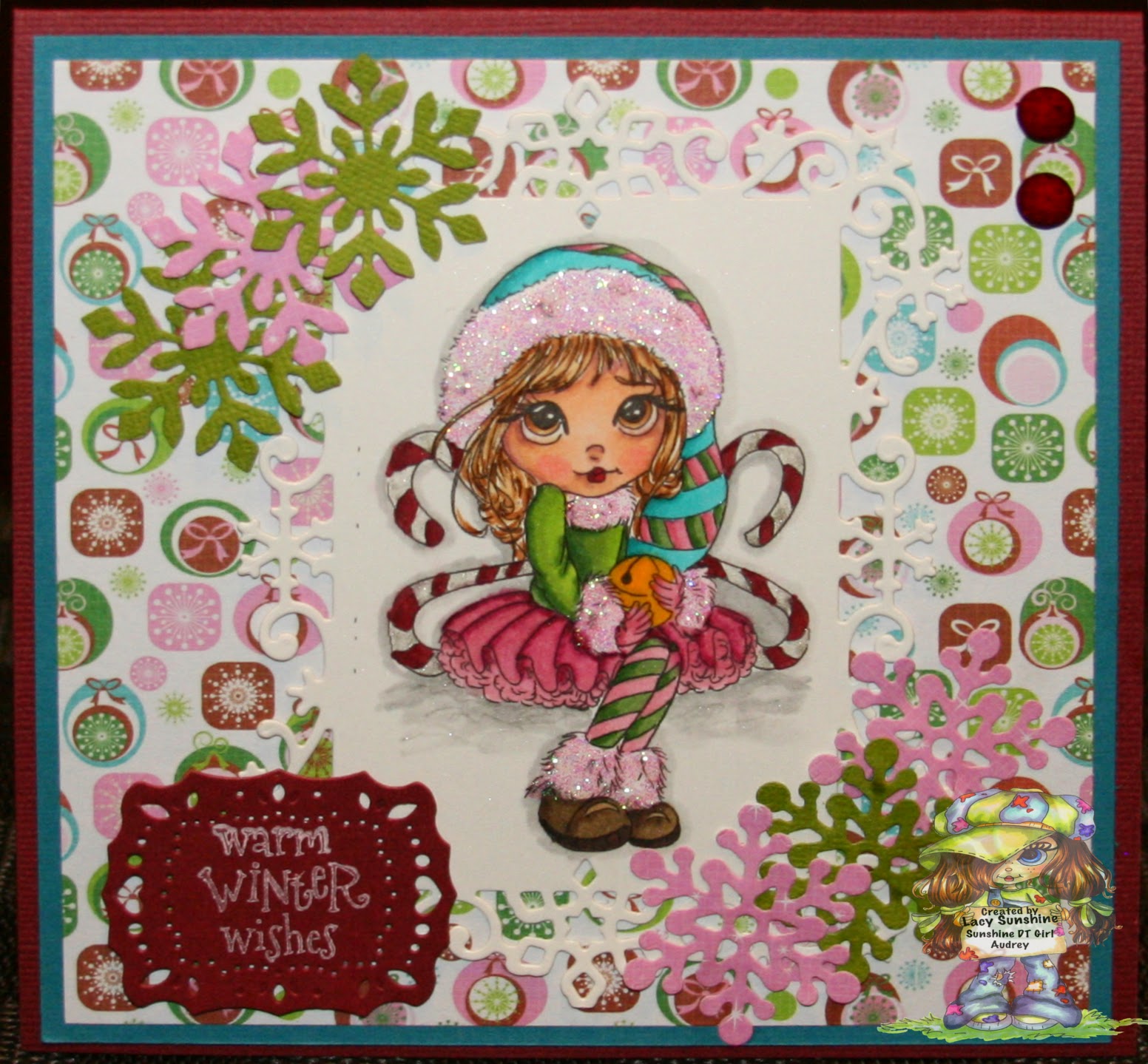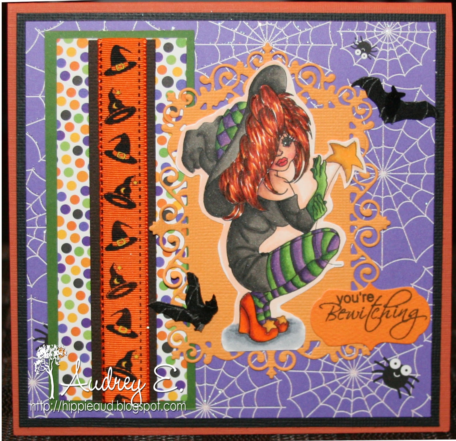 Whimsy Stamps Shop. I know it is past Halloween, but I really love this image and had started coloring it before Halloween and wanted to finish it. I used Copis to color this beauty and cut her out with scissors. I chose DP from Doodlebug Designs and CS from American Crafts and Bazzill. Ribbon is from my stash, bat stickers are Little B and sentiment is from My Craft Spot and cut out with Lifestyle Crafts die. Die behind the image is Joy! Crafts. I sure hope you like it and thanks so much for looking!!