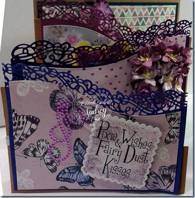 The other pages of the card are decorated with Flowers from I Am Roses and butterfly from Prima. The dies I used for the tops of the wavy parts of the cards are from Heartfelt Creations. Additional butterflies on the last page are from Prima as well with more Zva Creative bling. I sure hope you like it and have enjoyed learning how I constructed it.Audrey DT